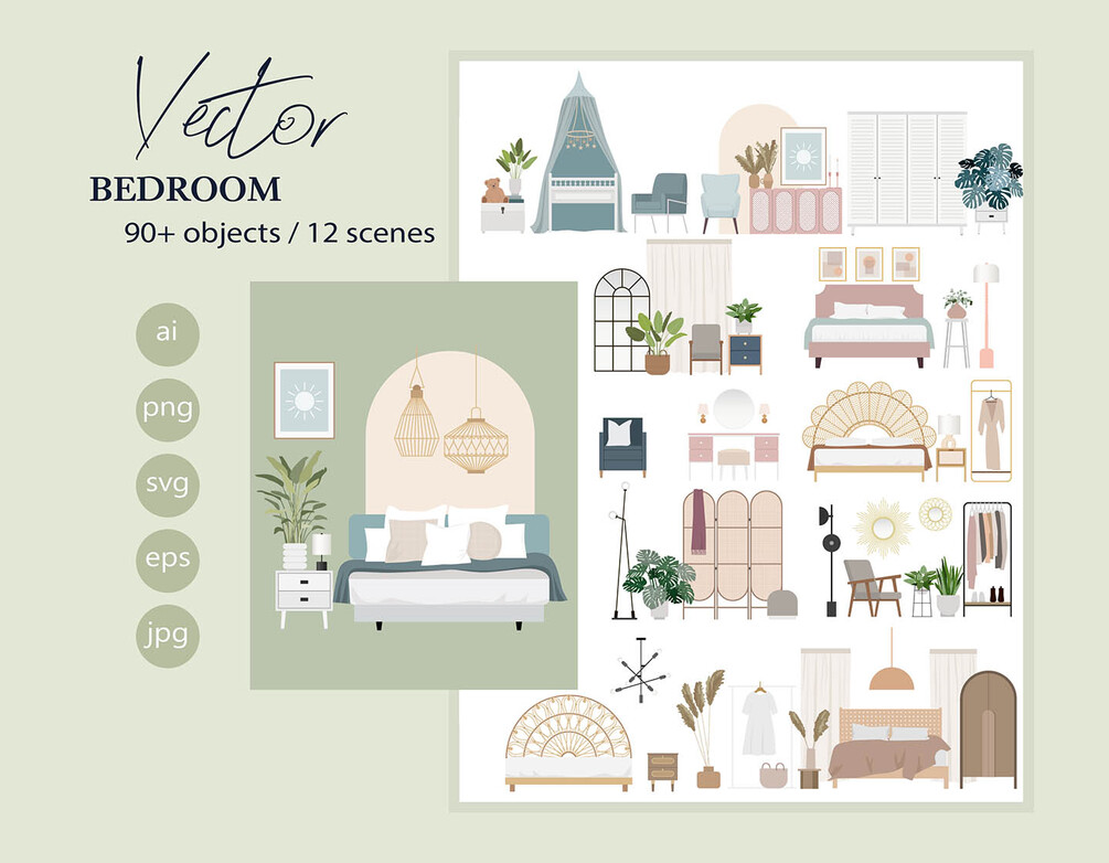 In addition to the kitchen and living room sets, we offer you to purchase another big vector set on the "Bedroom" theme.